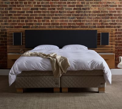 Una cabecera de madera maciza cuidadosamente fabricada, y equipada con la innovadora tecnología de Bang & Olufsen. Diseñada y desarrollada en colaboración entre Bang & Olufsen y DUX.