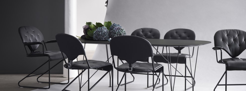 Mesa de comedor ovalada que estimula la conversación y el contacto visual con todos los comensales. También está disponible en otras dos versiones: una mesa de comedor con dos tableros extensibles y una mesa de centro más pequeña.