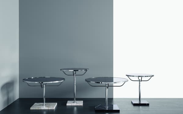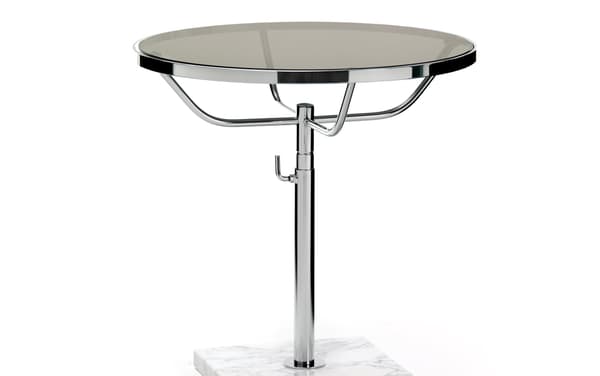 Mesa redonda clásica de cromo con ajuste manual de la altura y base de mármol.