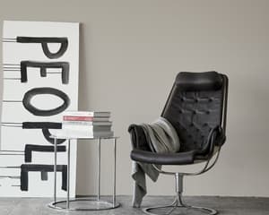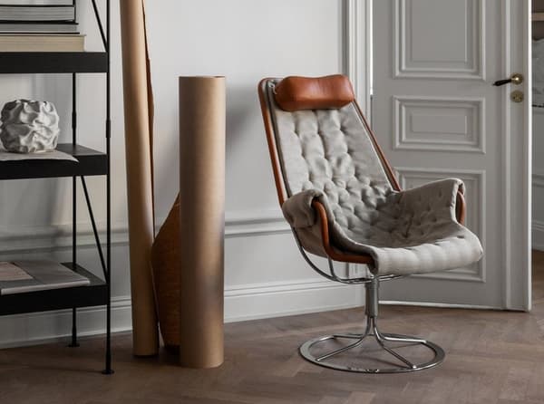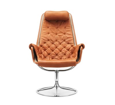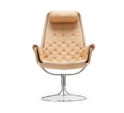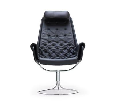 Emblemática poltrona diseñada por Bruno Mathsson. La silla Jetson refleja tanto su obsesión por la comodidad como un enfoque en el clásico y moderno diseño sueco. Cuenta con un asiento en forma de cuenco, respaldo alto de diseño ergonómico y un cojín para la cabeza. Base giratoria de cromo con un mecanismo de autoretorno único.