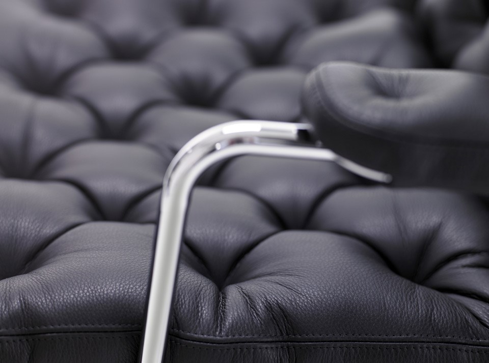 Karin es una silla lounge clásica y elegante, diseñada con una estructura de cromo fino y un cojín con costuras profundas.